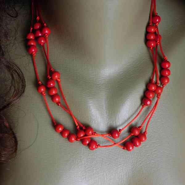 Dřevěné korálky barevné navlečené na červeném cottonu, oddělené součky. Délka je asi 50 cm.