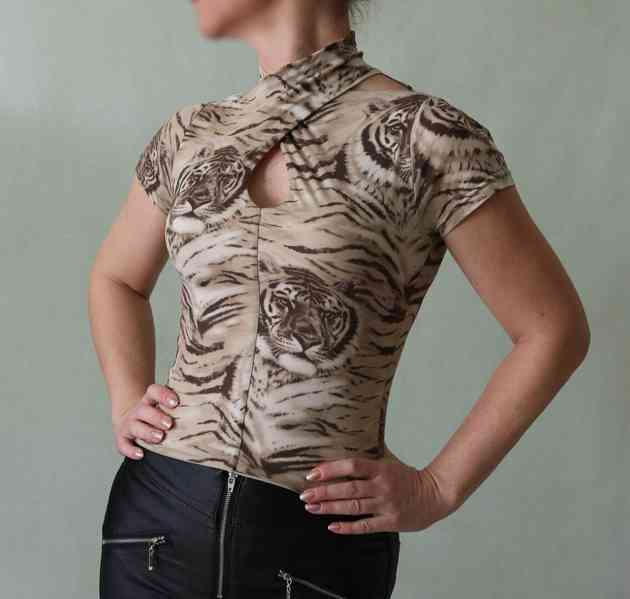 C&A tričkorolák s tygříky a velmi zajímavým stojáčkovým zavinovacím výstřihem. Obléká se přes hlavu, oblékání je trochu složitější, ale efekt stojí za to. Materiál 100% nylon. Tričko je nošené, v pěkném stavu bez vad. Velikost XS / 34