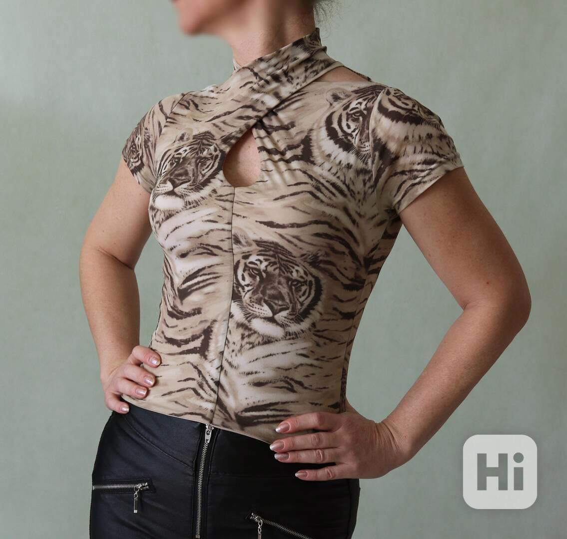C&A tričkorolák s tygříky a velmi zajímavým stojáčkovým zavinovacím výstřihem. Obléká se přes hlavu, oblékání je trochu složitější, ale efekt stojí za to. Materiál 100% nylon. Tričko je nošené, v pěkném stavu bez vad. Velikost XS / 34