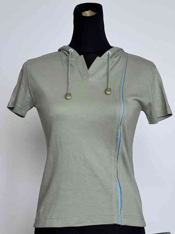 Zelené tričko se šněrováním, vel. S, podpaží v klidu cca 2x39 cm, pas cca 2x35 cm, natáhne se. Délka cca 59 cm. Vzaté jen párkrát.