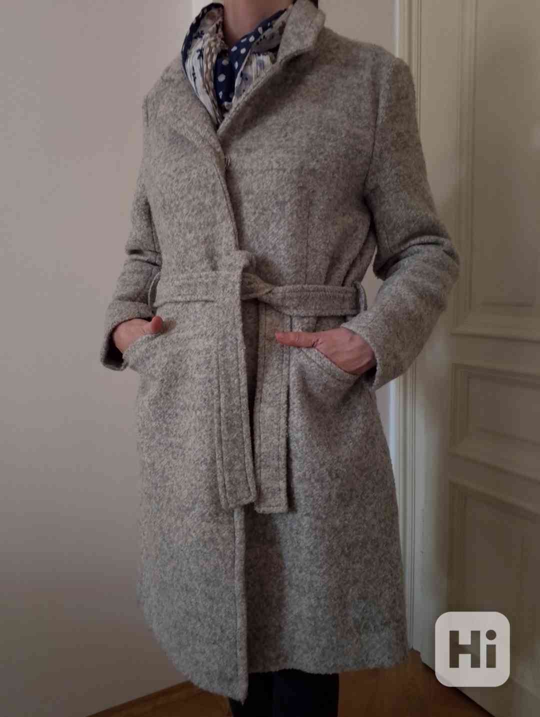 Prodám velmi pěkný šedý kabát - podzimní/zimní vel. 38/40 (viz. foto). Materiál: 100 % polyester; podšívka - 100 % polyester