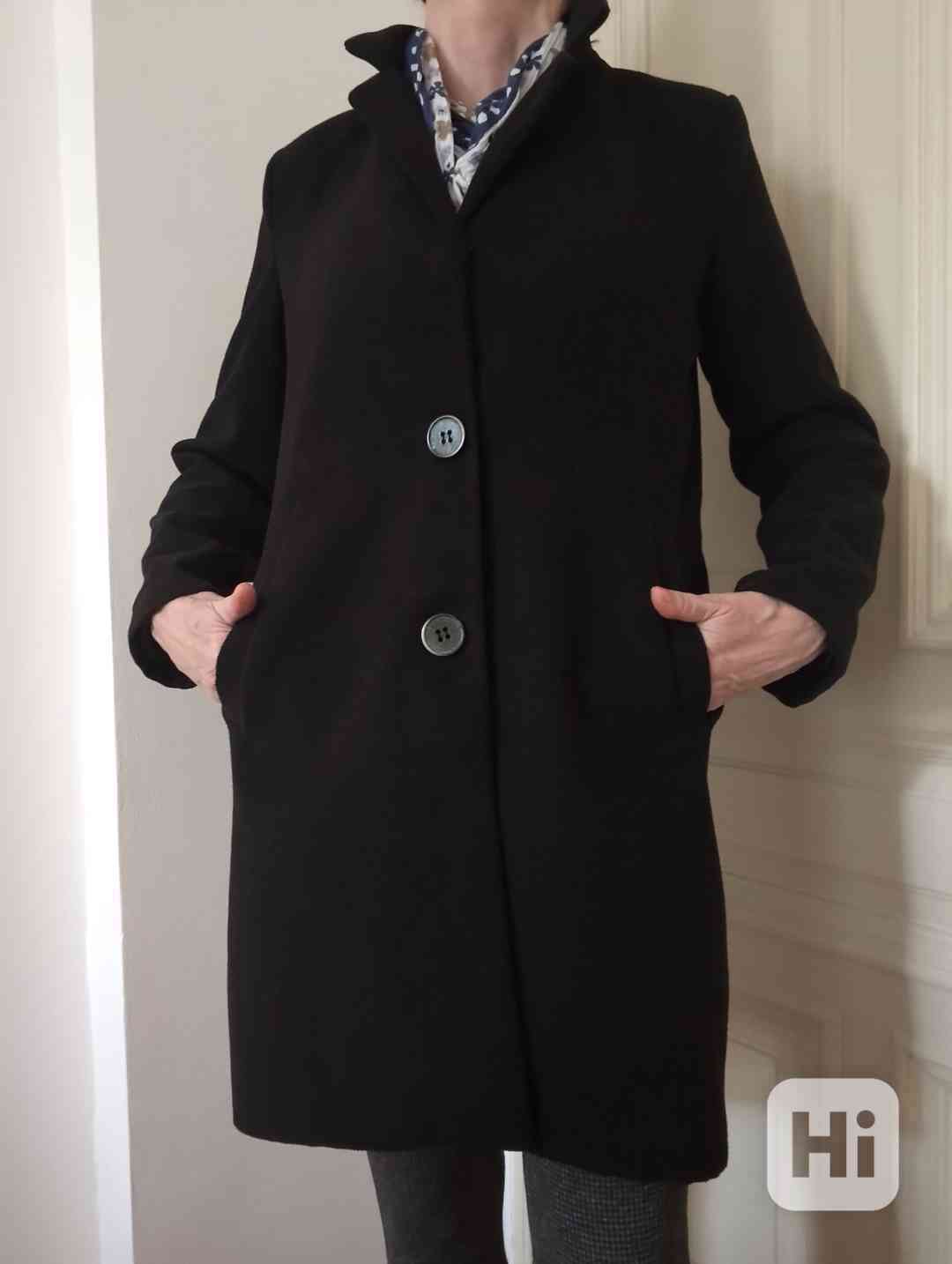 Prodám velmi pěkný černý kabát - podzimní/zimní vel. 38/40 (viz. foto). Materiál: 100 % polyester; podšívka - 100 % polyester