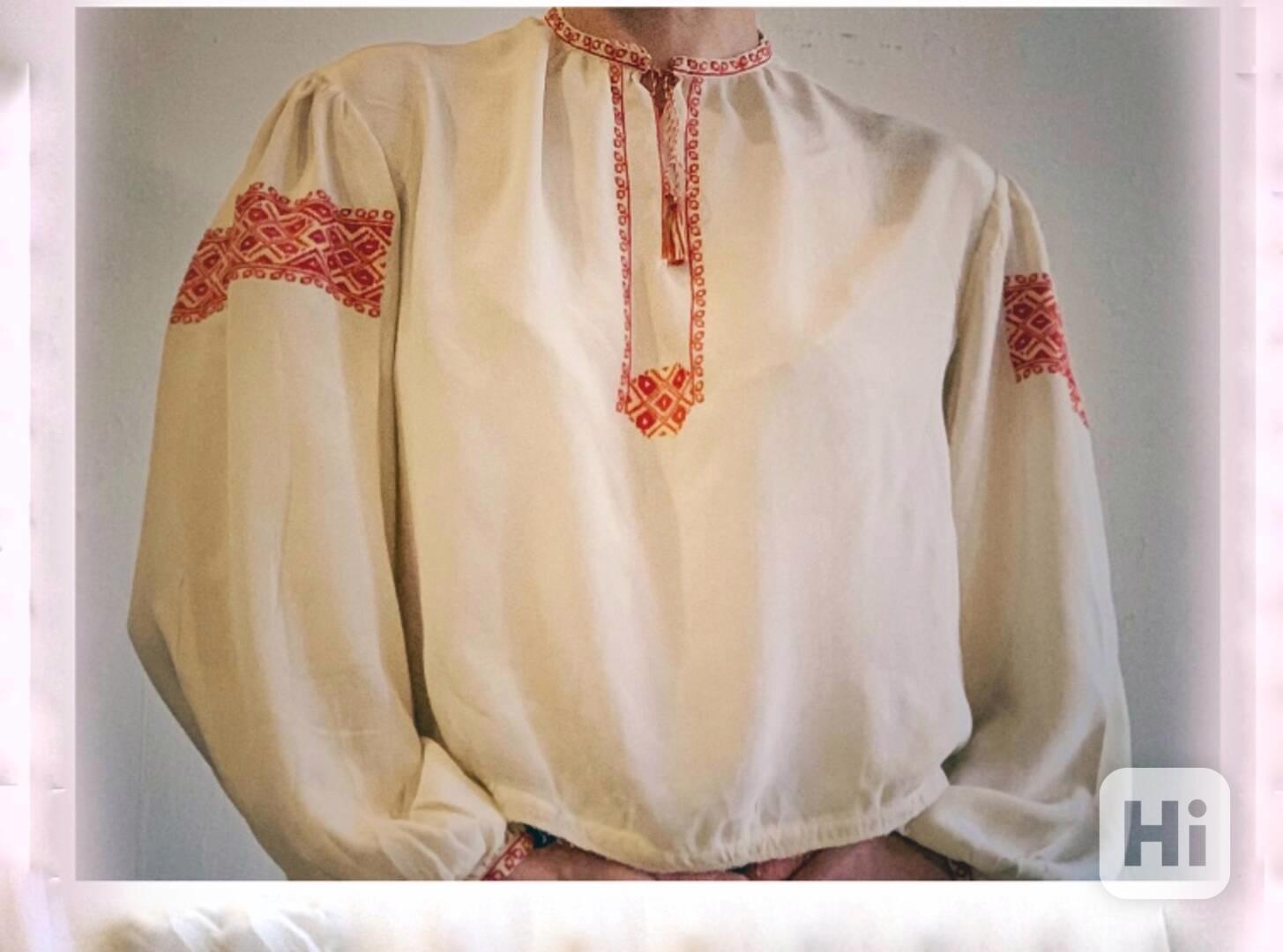 Nabízím krásnou vintage vyšívanou košili – ruční práce, původ z Ukrajiny. Vyšívaná jemným křížkem v tradičních barvách: červená (síla, ochrana, energie) a žlutá (slunce, úroda, život).