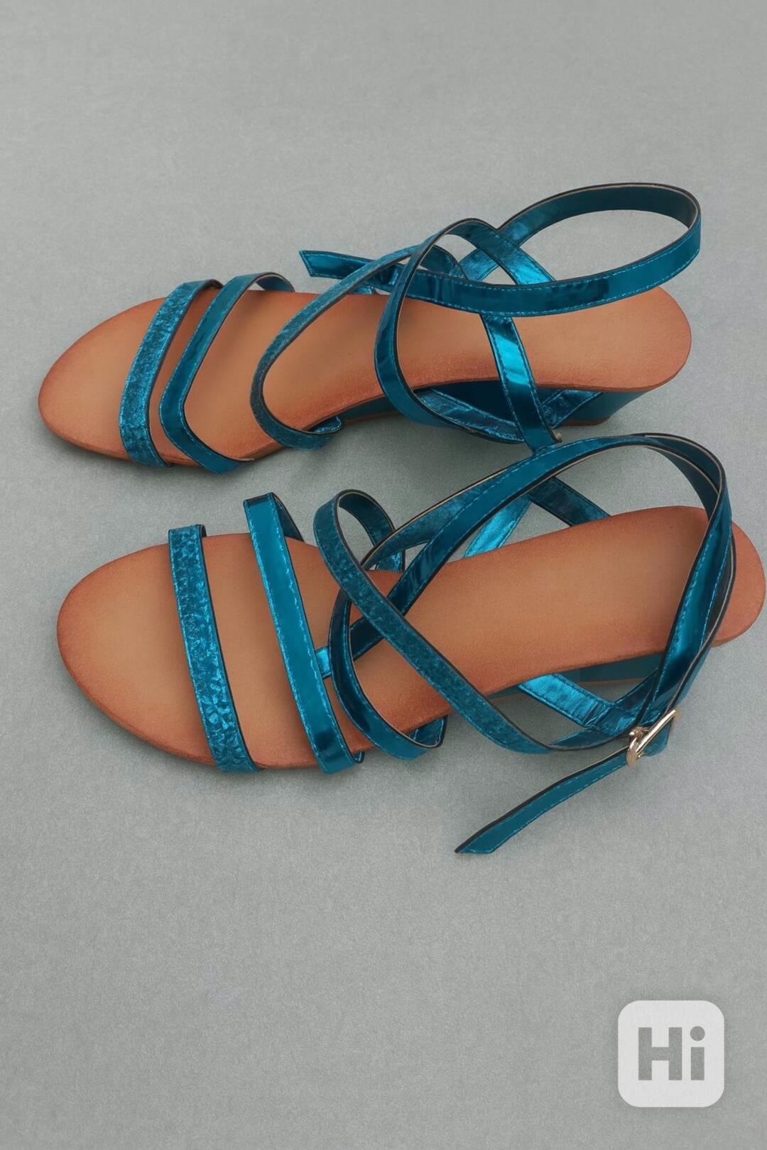 Prodám nové, nikdy nenošené dámské sandály v tyrkysové metalické barvě.
