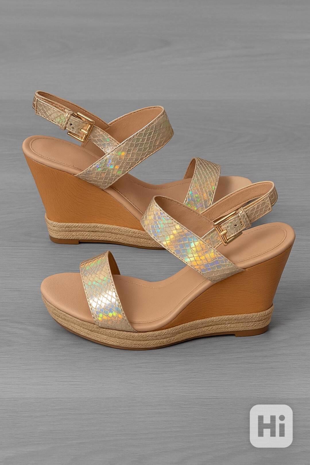 Prodám nové, nikdy nenošené dámské sandály ve zlatém provedení s jemným leskem. Letní model na klínku s páskem přes špičku a zapínáním kolem kotníku na přezku. Klínek je stabilní a pohodlný, vhodný i na delší nošení.