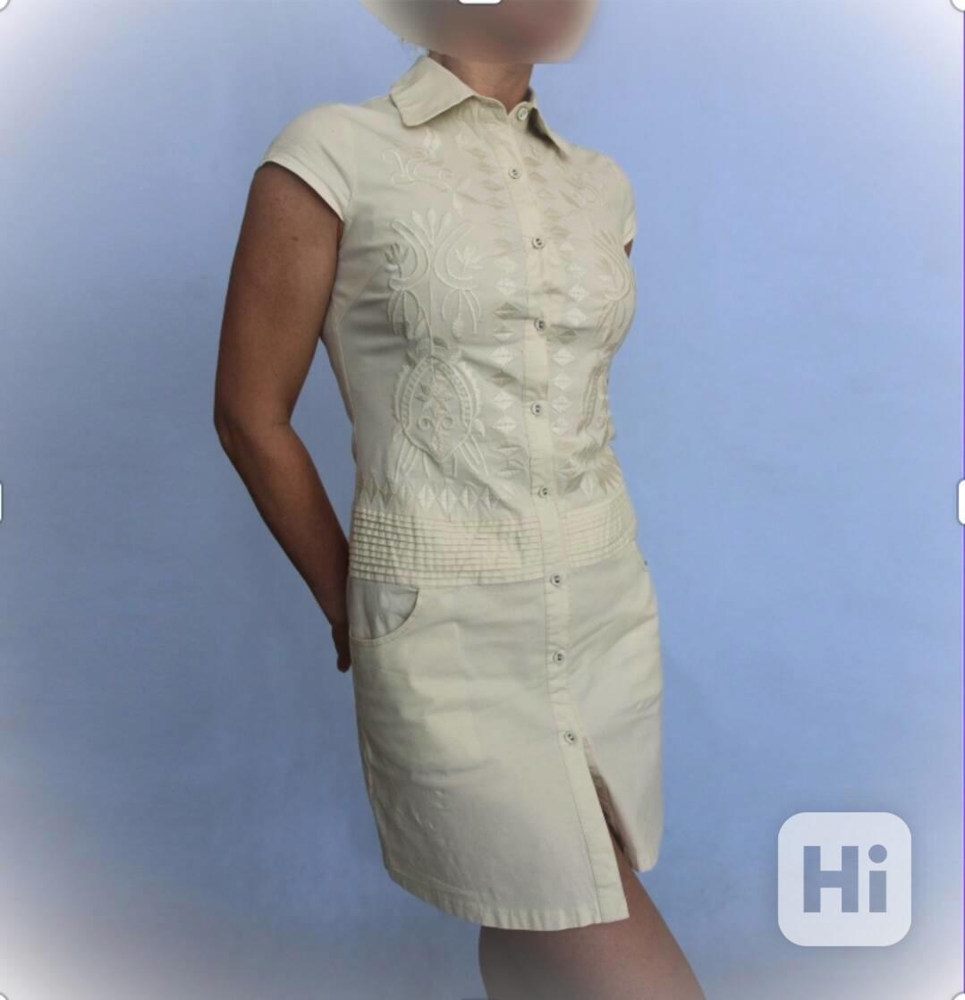 Letní upnuté propínací minišaty světlé žlutokrémové - vanilkové barvy. Materiál je pružná tkanina 97% bavlna, 3% elastan. Mají zajímavé pečlivě vypracované detaily - řady příčných sámků níže pasu, kapsičky, na předních dílech jsou bohatě vyšívané ornamentálním vzorem. Velikost je značena S/M. Dle mého spíš XS-S, jelikož na postavu 38 už jsou malé. Rozměry bez natažení: délka 84 cm, přes prsa 82 cm, pas 74 cm, boky 90-92cm. Šaty jsou v perfektním stavu, oblečené pár krát. Odešlu poštou, BAlíkovnou nebo Zásilkovnou, cenu za odeslání dám vědět předem.