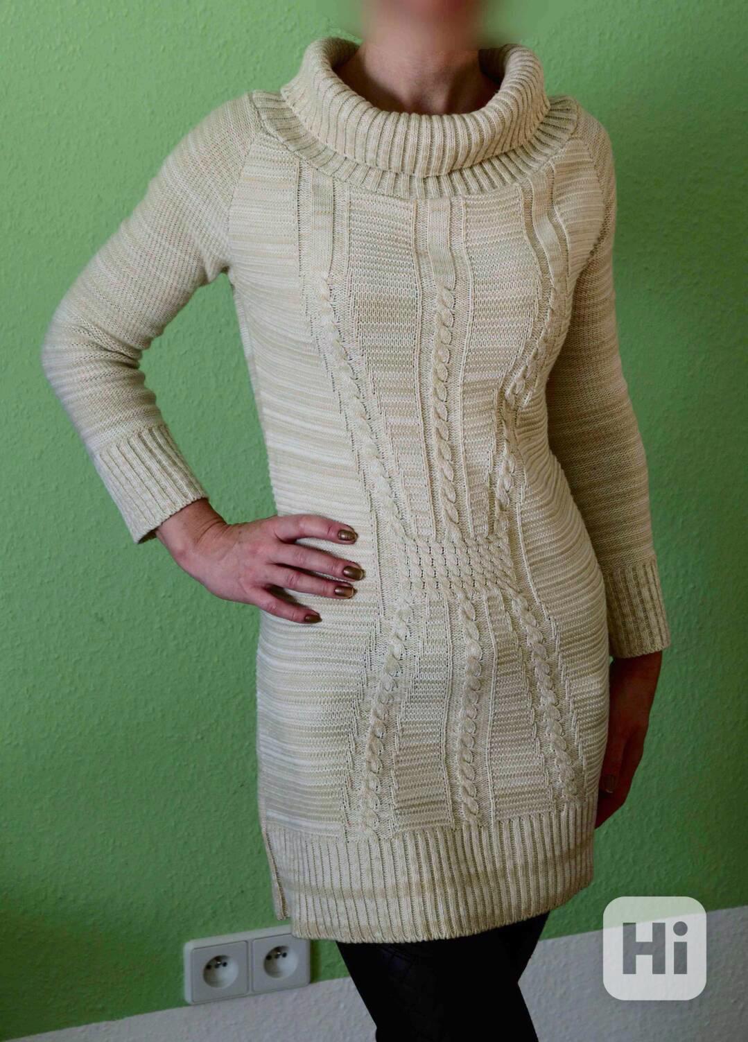 Silnější dlouhý svetr z melírované příze - přírodní a krémová, se vzorem osmiček na předním díle, límec je volnější chomoutový rolák. Svetr nemá žádné známky nošení, stav super. Velikost není uvedena, řekla bych že odpovídá asi velikosti M-L. Přesné rozměry Vám ráda zašlu. Odeslání poštou, Balíkovnou nebo Zásilkovnou, cenu za odeslání dám vědět předem.