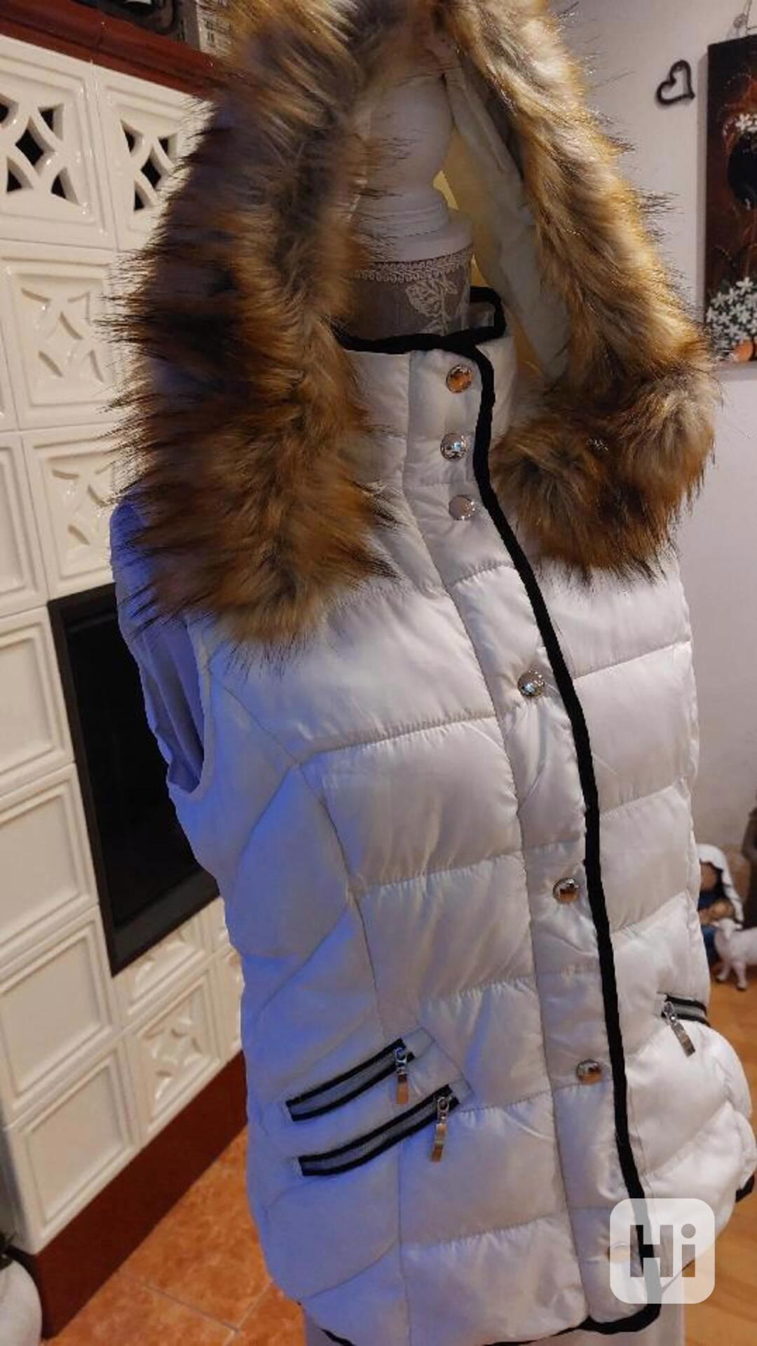 Krásná krémová vesta s odnímatelnou kapucí na zip. Kapuce je lemovaná odnímatelnou kožešinou také na zip. Vesta má zapínání na krytý zip a druky. Krémová podšívka. Zapínání i kapsy a stojáček lemované černou ozdobnou lemovkou. Po stranách všité kapsy se zipy. Jedna falešná kapsa se zipem vpravo. Velikost XL, šířka hrudník 106, délka 64cm. Materiál 100% polyester, praní na 30. .