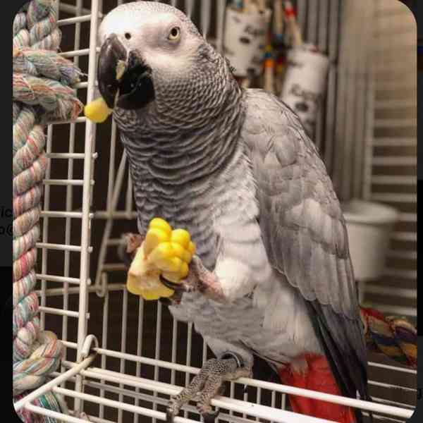 Krásný papoušek šedý. Je v PERFEKTNÍM peří a jí zdravou stravu z obohacených granulí a ovoce/zeleniny. Zatím dokáže říct jen pár slov, ale je opravdu ráda, když se učí nové věci, a je velmi hravá. Hodně se chová a nechá se pohladit po zádech. Jako většina ptáků může být v kleci. Je opravdu úžasná a na papouška relativně tichá. Dovolujeme jí hrát si mimo klec celý den a nedostává se do žádných problémů ani neodlétá.