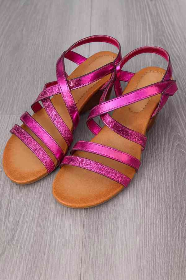 Prodám nové, nikdy nenošené dámské sandály v krásném metalickém růžovo-fuchsiovém odstínu.