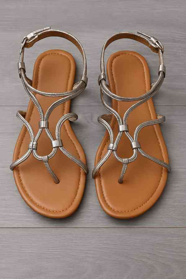 Letní model s páskem mezi prsty a zapínáním kolem kotníku, který dobře drží na noze. Sandály mají zajímavě řešené pásky přes nárt a hnědou stélku, díky čemuž působí přirozeně a snadno se kombinují s letním oblečením.
