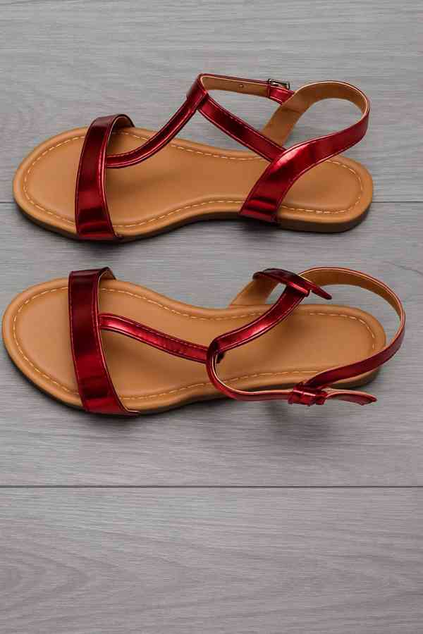 Prodám nové, nikdy nenošené dámské sandály v červeném metalickém provedení. Letní model s páskem přes nárt, páskem mezi prsty a zapínáním kolem kotníku, které dobře drží na noze. Sandály mají měkkou hnědou stélku, jsou lehké a pohodlné.