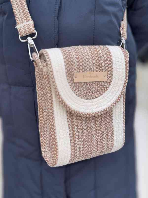 Rozměr 35 x 37 cm. Odšité dno 7 cm. Délka popruhu až 170 cm. Uvnitř bavlněná podšívka. Na jedné straně jedna větší kapsa, na druhé straně dvě menší kapsy.