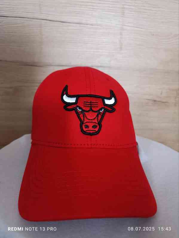 Stylová červená kšiltovka s výraznou výšivkou loga Chicago Bulls (NBA) na přední straně. Klasický zahnutý kšilt, 6panelová konstrukce s větracími otvory.