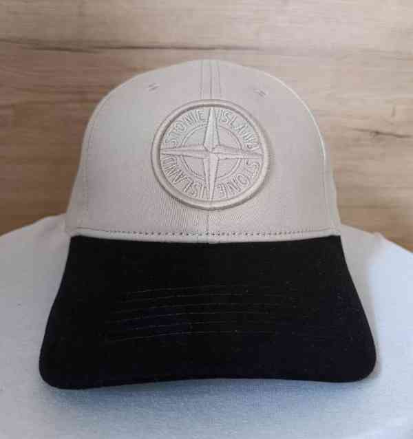 Stylová kšiltovka značky Stone Island v kombinaci béžové (krémové) horní části a černého kšiltu. Na přední straně je výrazná plastická výšivka ikonického kompasového loga Stone Island tón v tónu. Zadní část je doplněna výšivkou nápisu Stone Island.