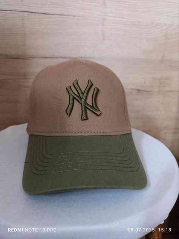 Kšiltovka New York Yankees (MLB) v kombinaci béžové (crown) a olivově zelené (kšilt). Na přední straně je plastická výšivka loga „NY“ v tmavě zelené barvě. Klasický šestipanelový střih s prohnutým kšiltem, větracími očky a nastavitelným páskem vzadu (kovová spona).