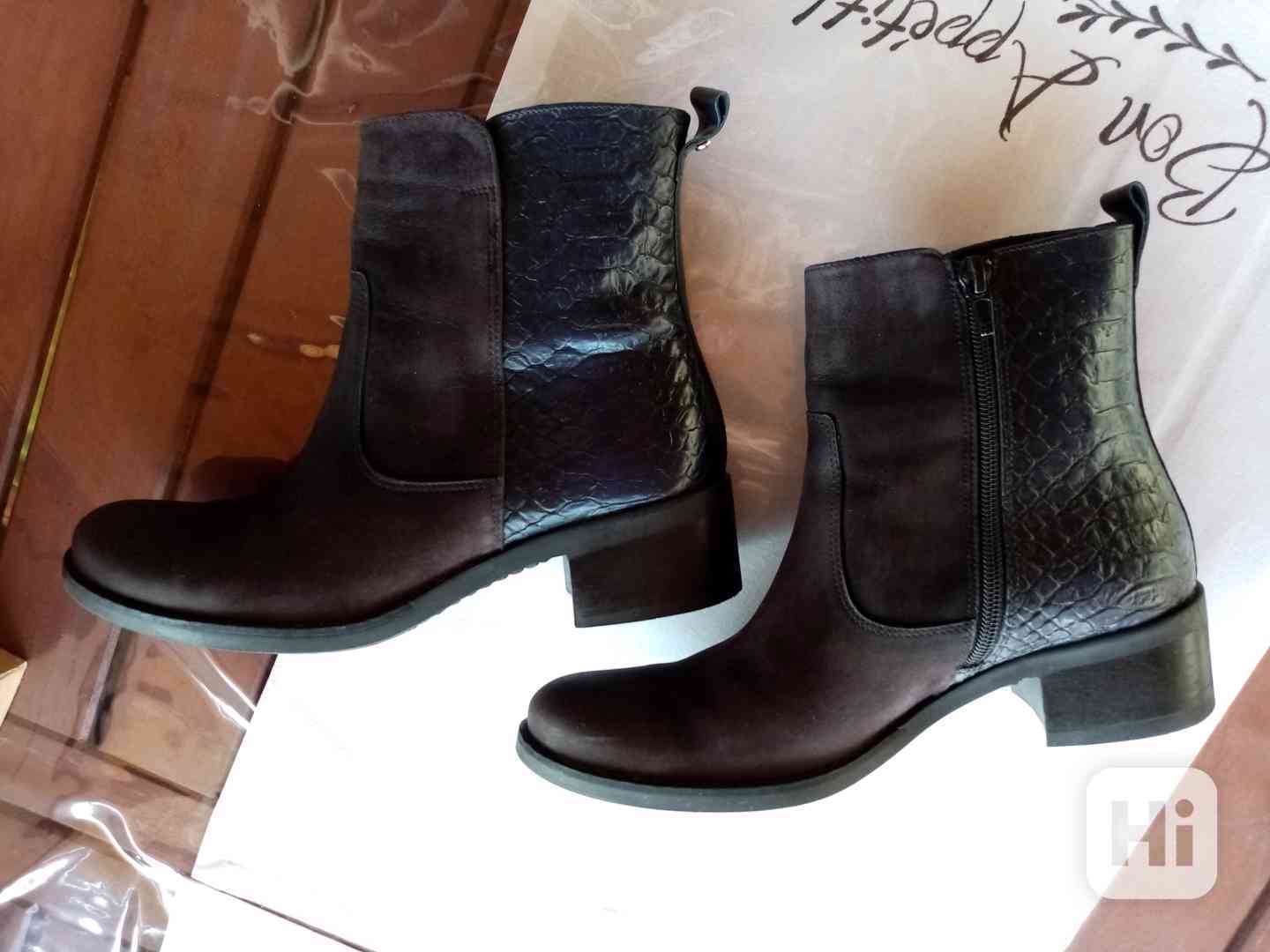 Kožené kotníkové kozačky Stival v kombinaci broušené černé kůže a tmavomodré krokokůže na patní části. Z vnitřní strany kozačky je zip. Zateplené černým filcem. Výška podpatku 4,4 cm. Velikost 38. Jen lehce užívaný stav leč stále velmi pěkné a nepoškrábané.