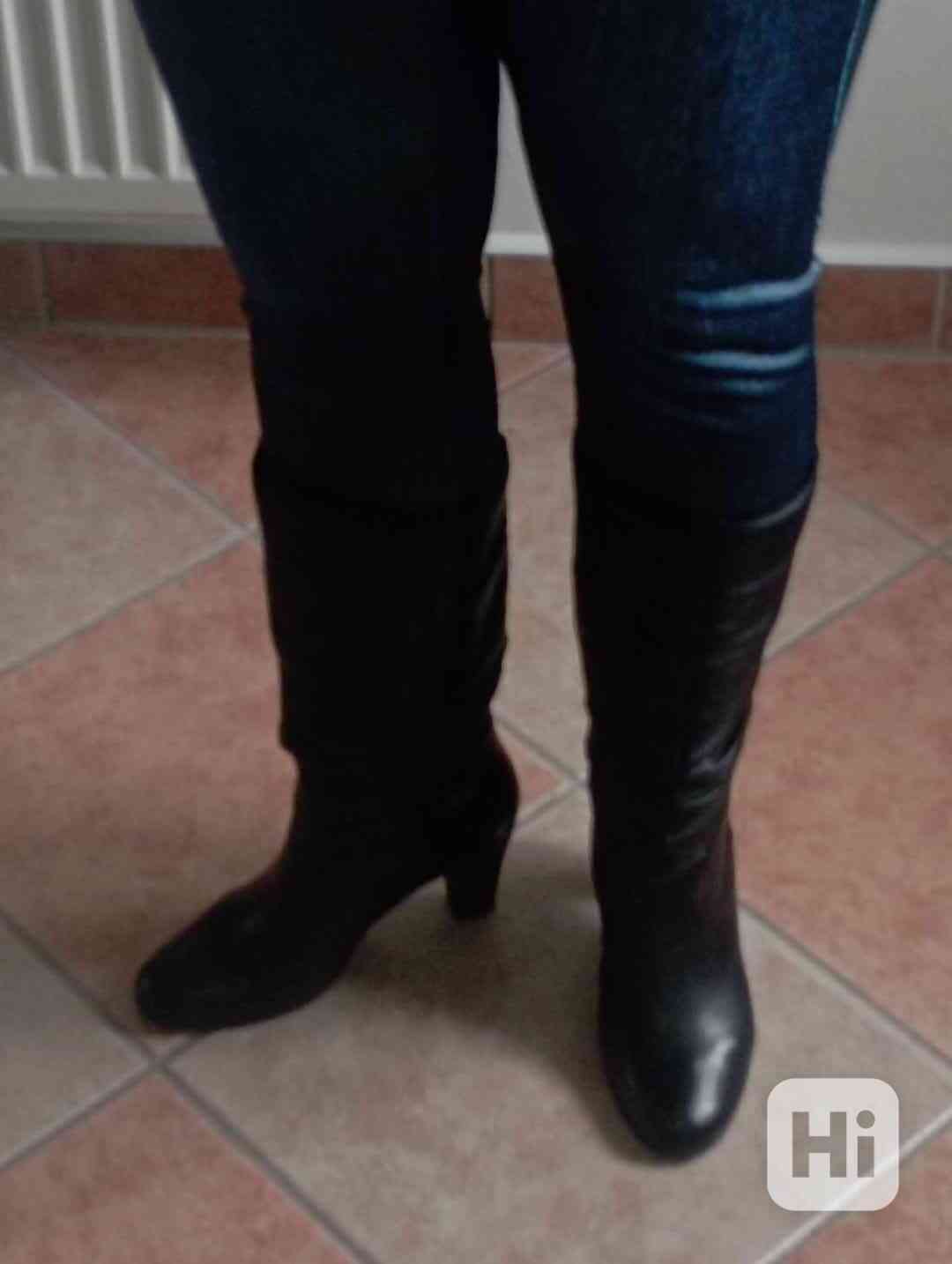 Černé kožené kozačky vel.39 na jaro nebo podzim. Podpatek 8 cm. Stabilní a pohodlné.