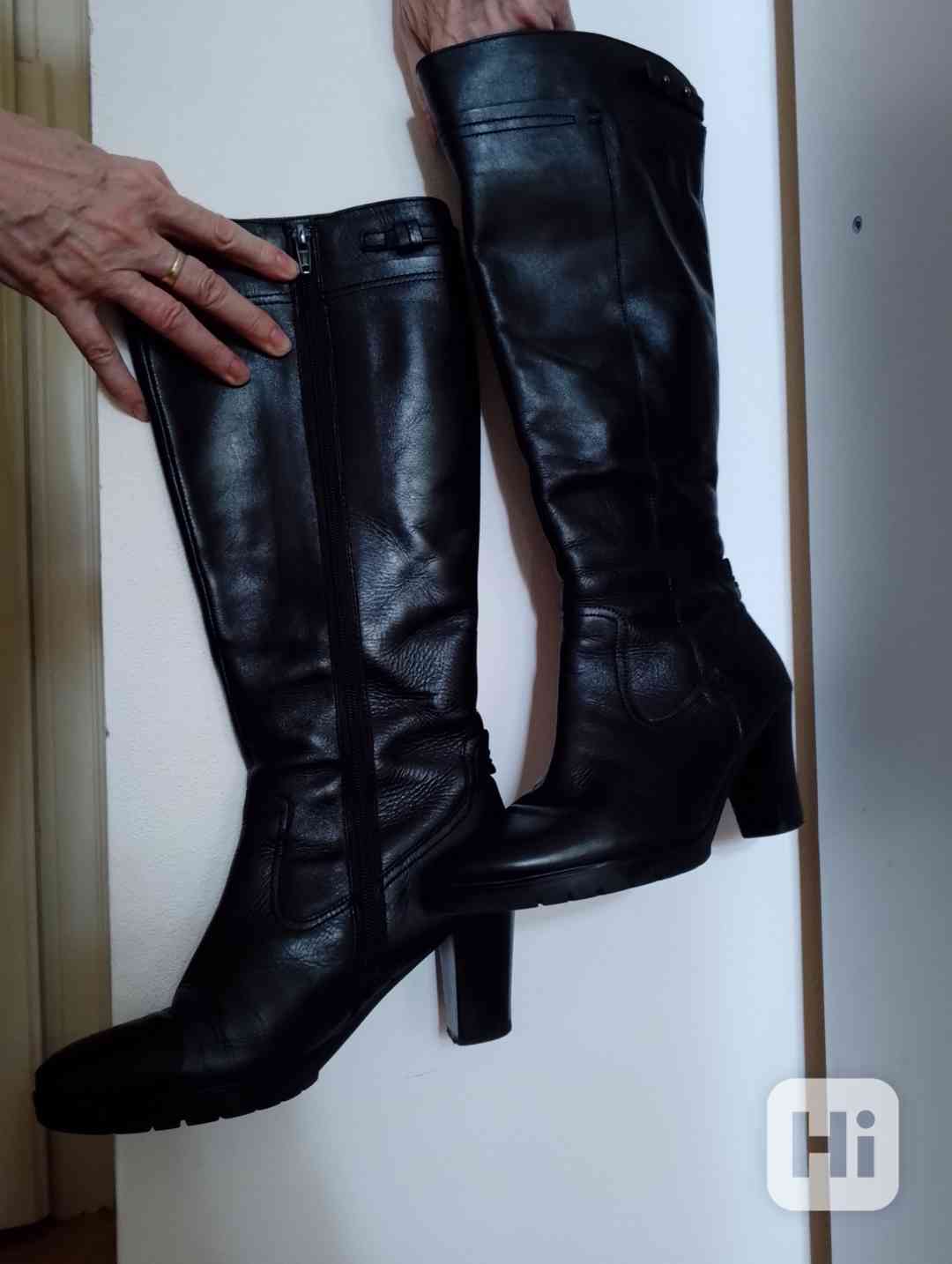 Prodám černé kozačky na podpatku z pravé kůže velikosti 39. Výška podpatku 7,5 cm. Rozměry viz. foto.