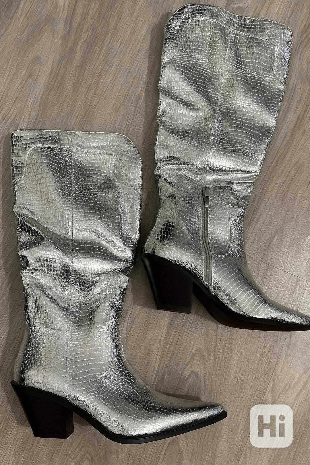 Nabízím k prodeji výrazné stříbrné kozačky s moderním lesklým povrchem a strukturou imitující hadí kůži.