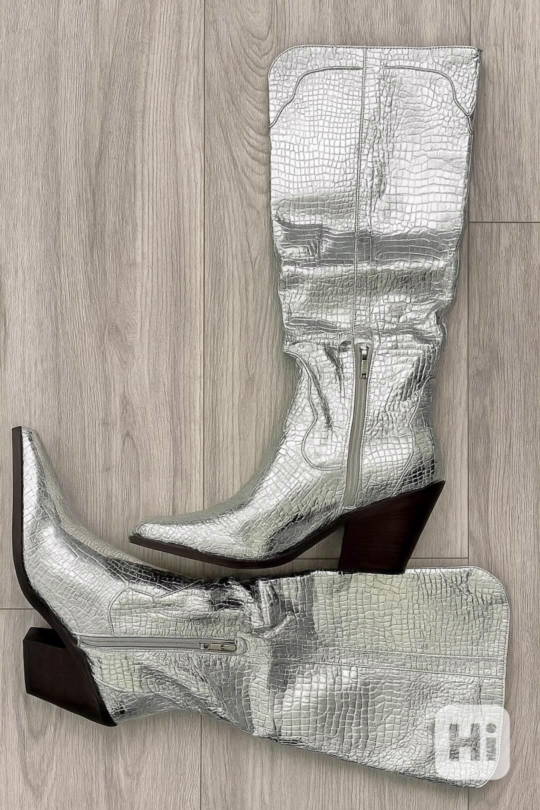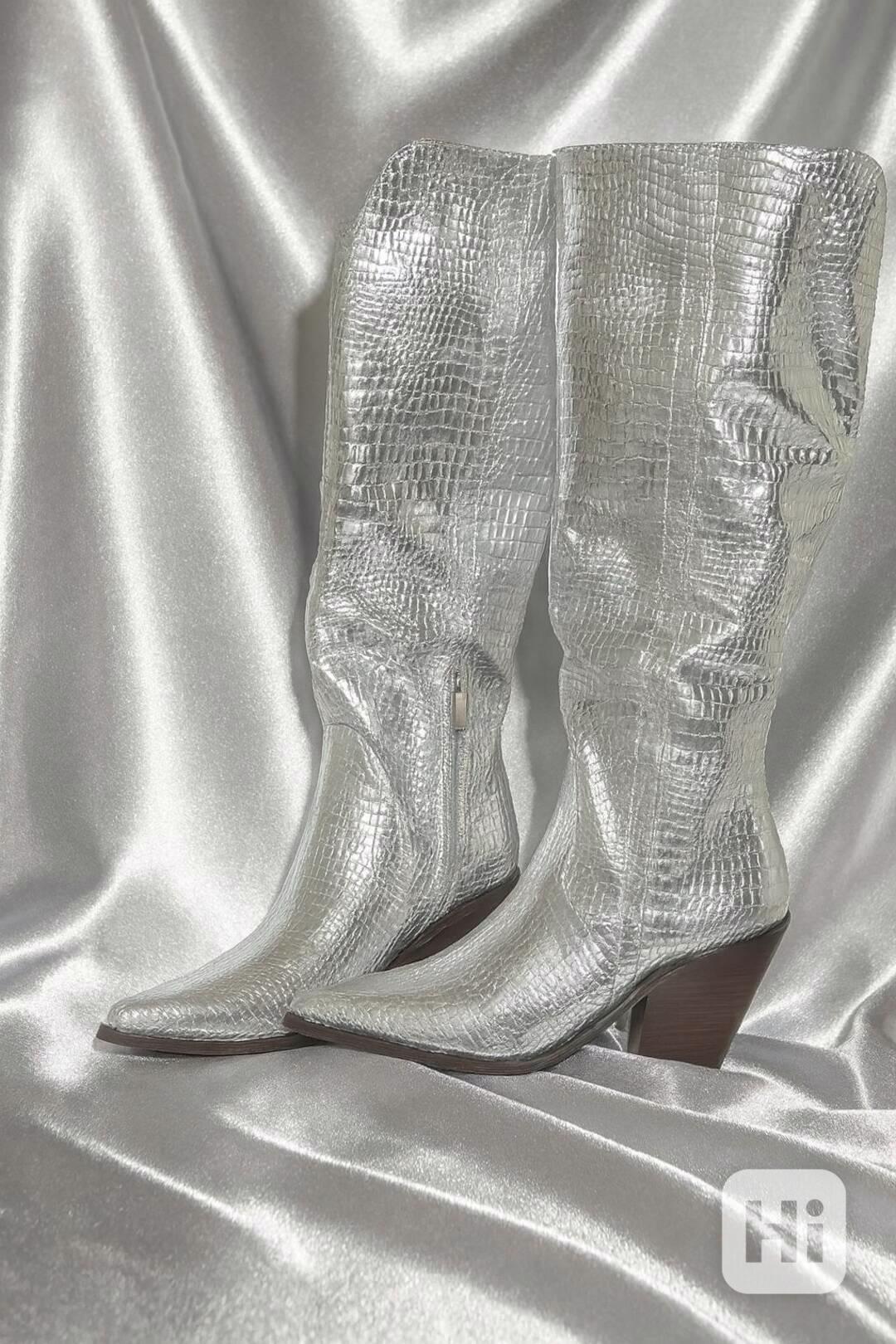 Nabízím nové a nikdy nenošené vysoké kozačky v luxusní metalické stříbrné barvě (velikost 40), které spojují moderní vzhled s maximálním komfortem.