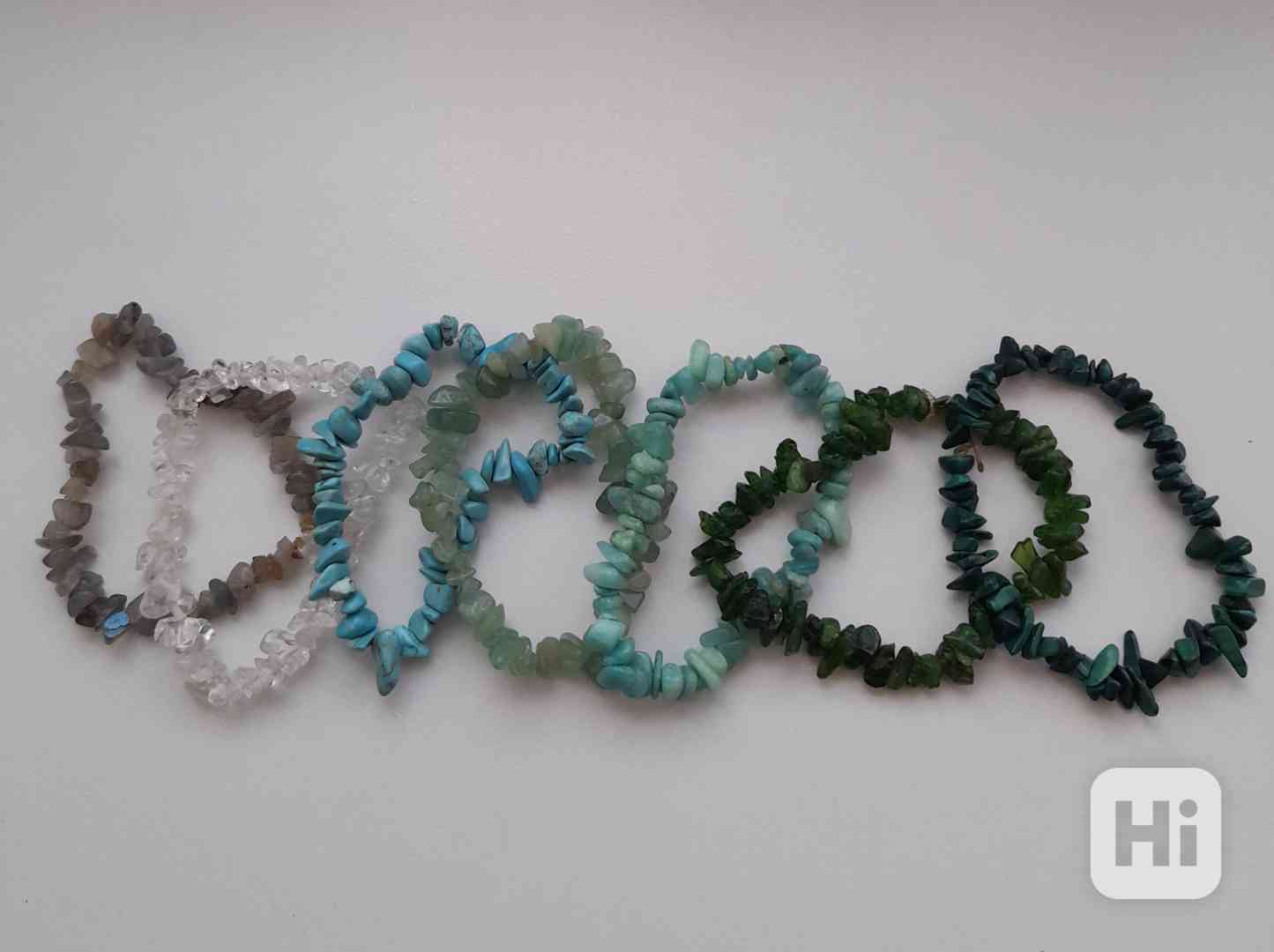 Prodám náramky ze sekaných minerálů: labradorit, křišťál, tyrkys, avanturín, amazonit, chromdiopsid (ruský smaragd) a malachit. Náramky byly nošené a jsou očištěny vodou. Cena za všechny náramky