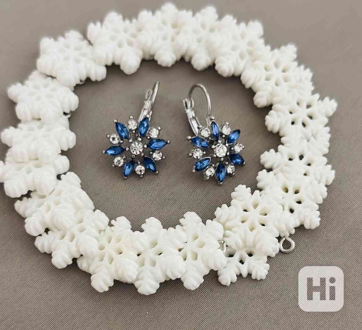Jemné náušnice ve tvaru vločky s průhledným a světle modrým umělým zirkonem.
