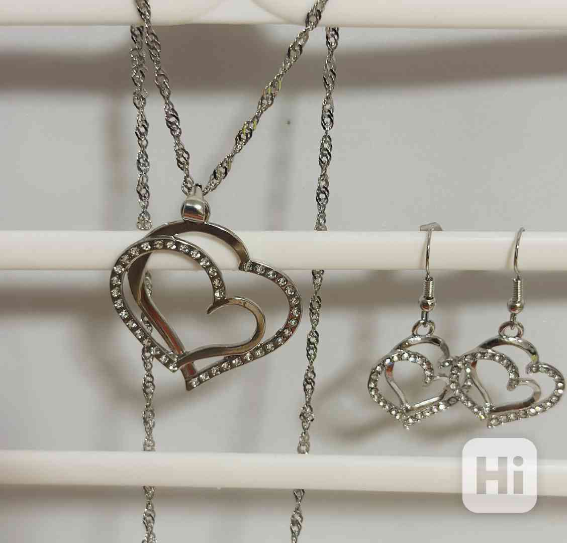 Souprava se skládá z náušnic a přívěsku na řetízku ve tvaru velkého plochého srdce.
