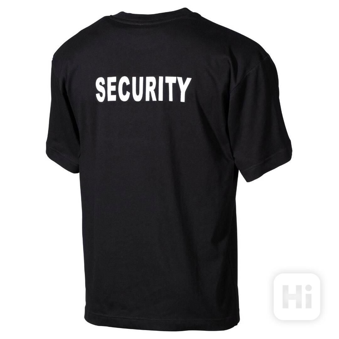 Černé tričko s potiskem SECURITY na zádech a malým potiskem SECURITY nalevo na hrudi.