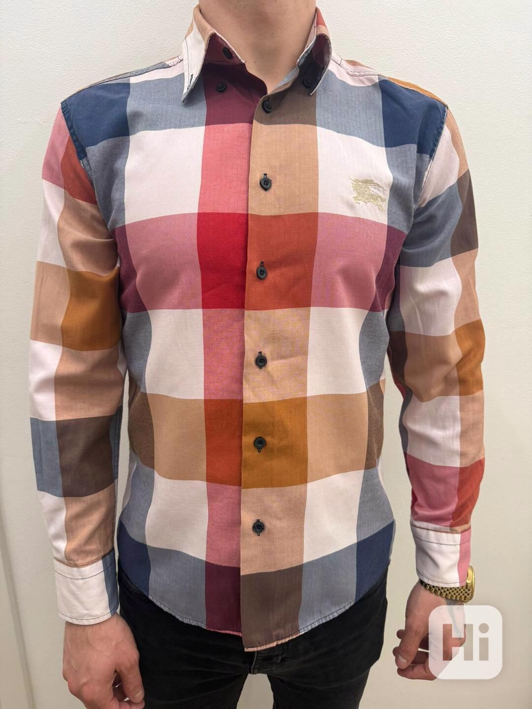 Prodám originální pánskou košili prémiové značky Burberry z řady London. Košile zaujme netradičním barevným kostkovaným vzorem v kombinaci vínové, modré, béžové a hnědé barvy. Látka má luxusní texturu rybí kosti (herringbone), která je velmi příjemná na dotek.