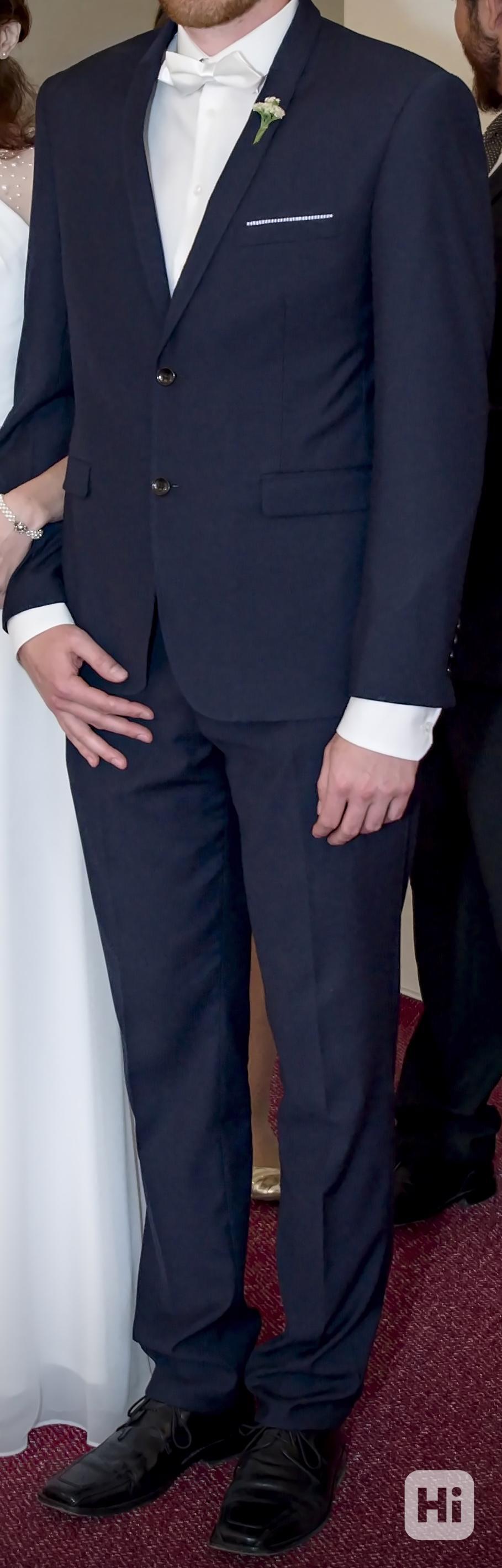 Modrý pánský oblek vel. L, Výborný stav, nošený celkem 3x, vyčištěný a vyžehlený v čistírně, viz poslední foto. Reálnému odstínu odpovídá barva na první fotce. Materiál 85% vlna, 15% polyester, značka GIORGIO ARTURO, rozměry: sako: délka 77 cm, šířka hruď cca 54 cm, délka rukávu od podpaží 46 cm.