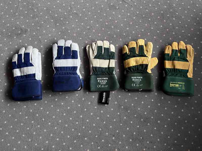 Protiskluzové pracovní rukavice. V oblasti úchopu jsou potaženy černým latexem se zdrsněnou strukturou pro dodatečnou ochranu a lepší uchopení. Okraj rukavic je opatřen lemováním.