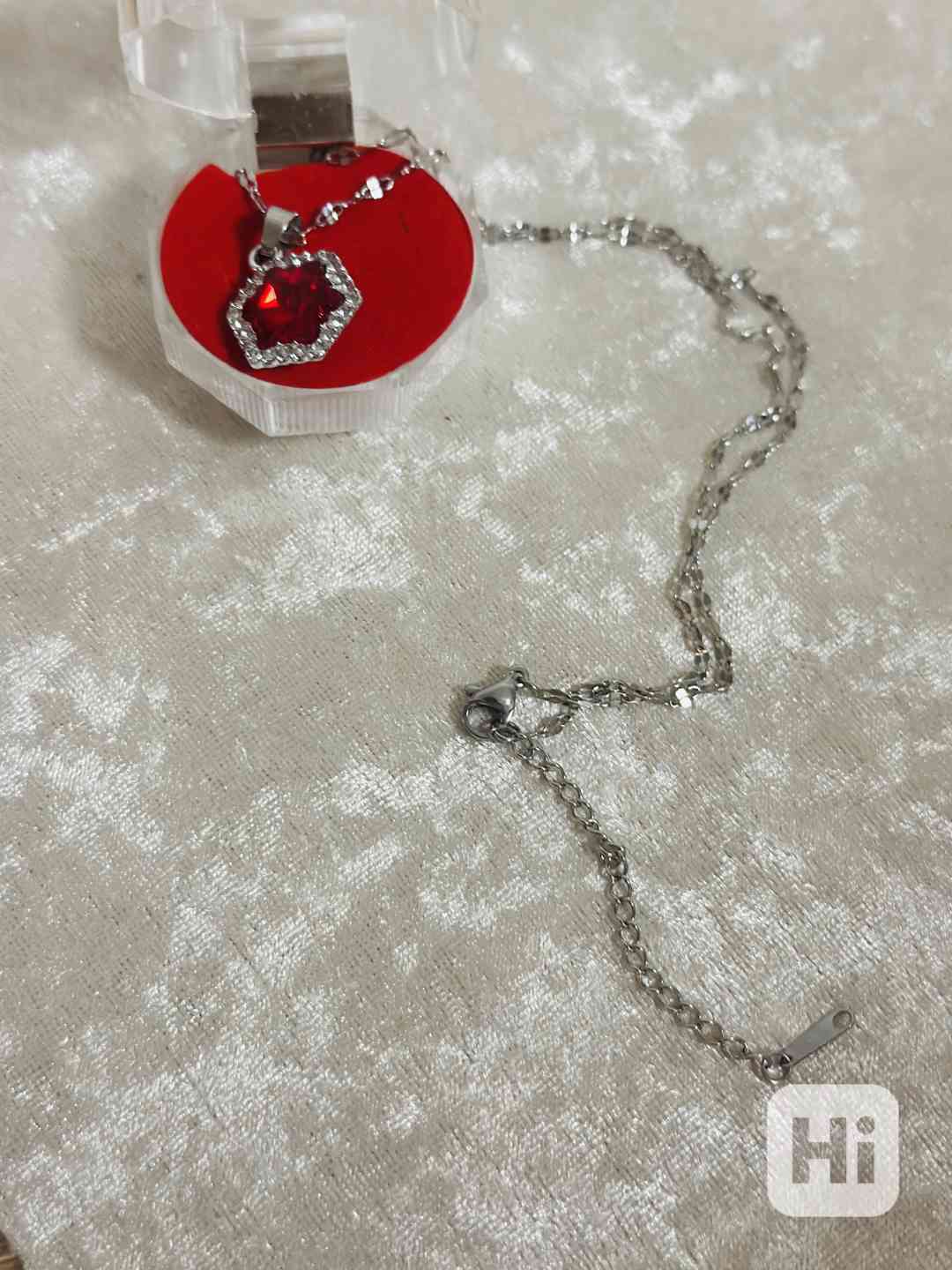 Řetízek z nerezové oceli s přívěskem s červeným kamenem.