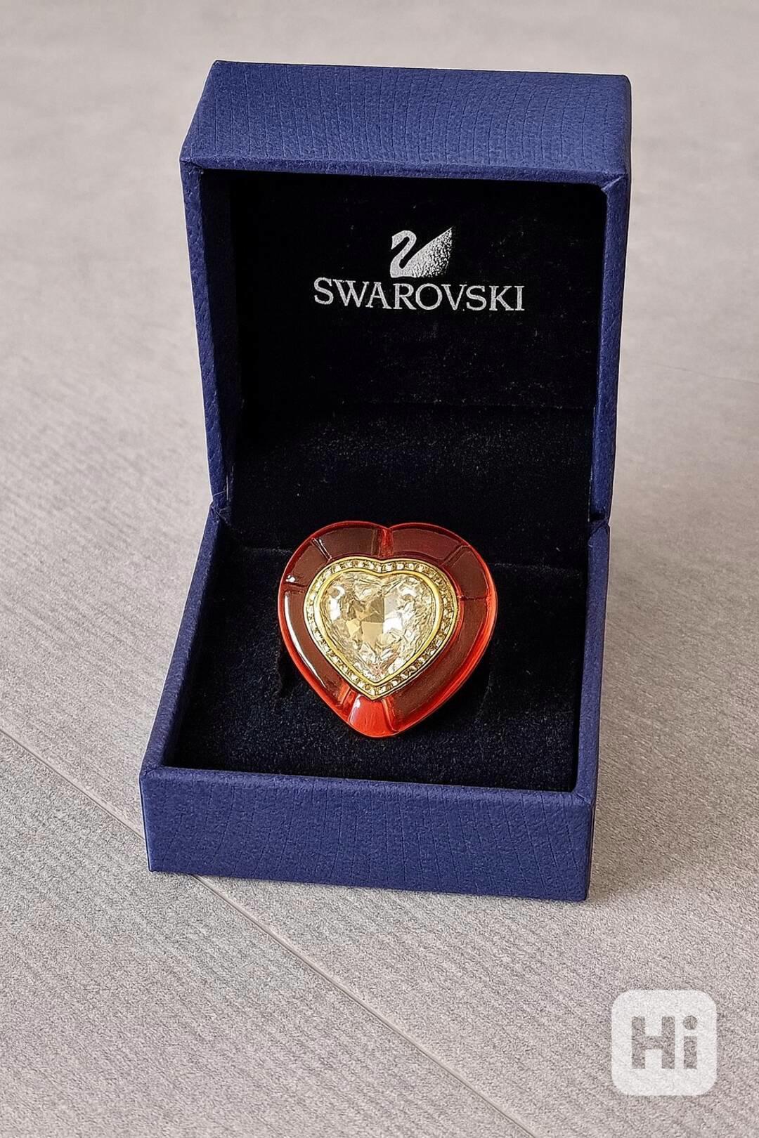 Růžový prsten ve tvaru srdce originál Swarovski je doplněn čirým krystalem ve tvaru srdce, obklopeným čirým pavé ve zlatém pokoveném rámu.