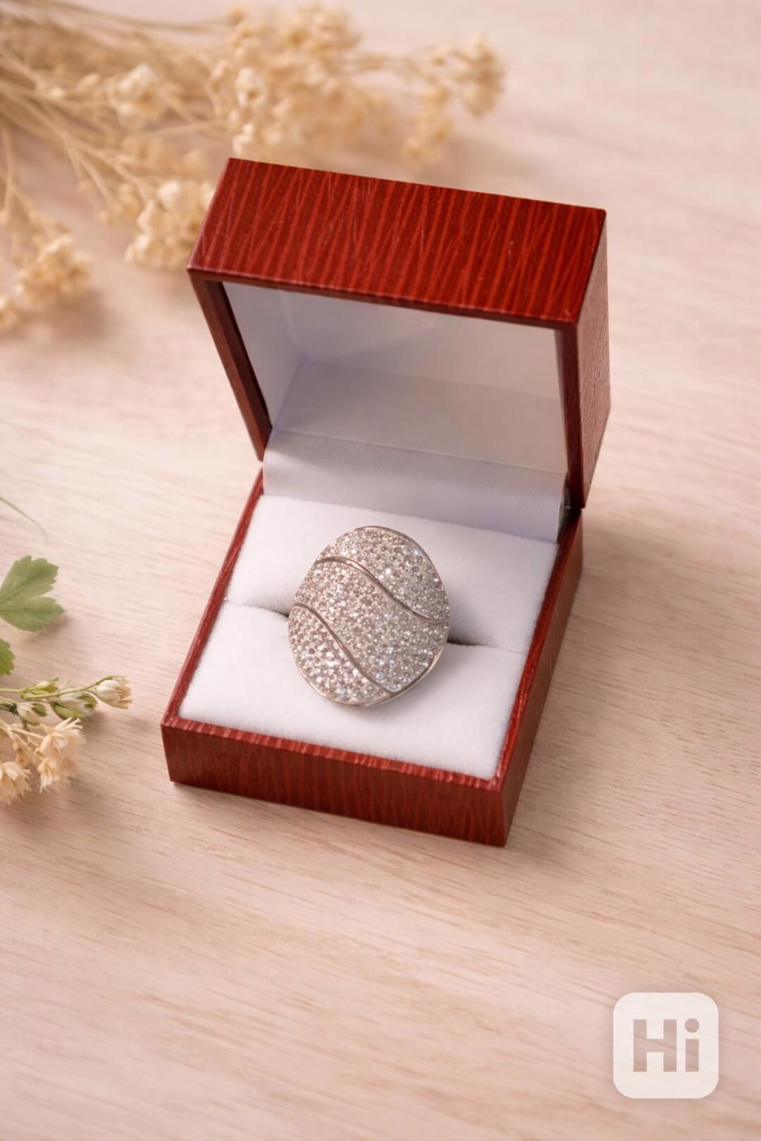 Nabízím k prodeji nový, nikdy nenošený výrazný prstýnek se stříbrným vzhledem. Prsten má dominantní oválný tvar, celý osazený drobnými čirými kamínky.