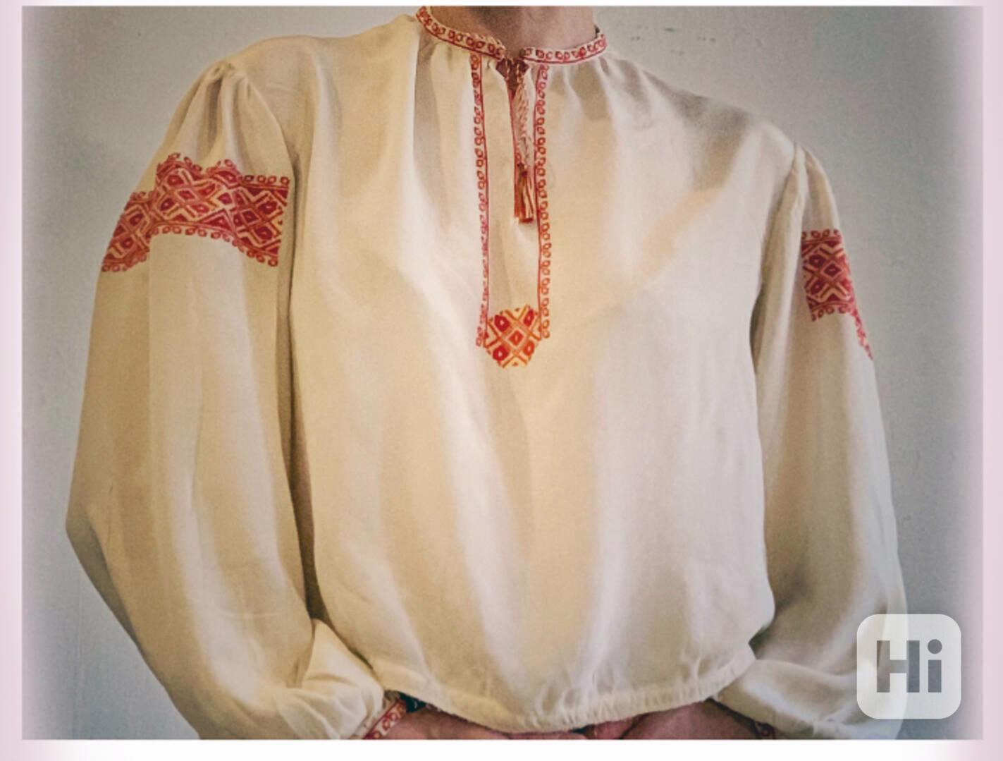 Nabízím krásnou vintage vyšívanou košili – ruční práce, původ z Ukrajiny. Vyšívaná jemným křížkem v tradičních barvách: červená (síla, ochrana, energie) a žlutá (slunce, úroda, život).