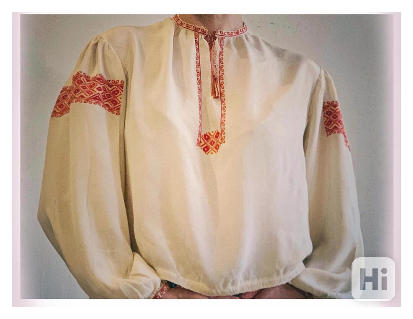 Nabízím krásnou vintage vyšívanou košili – ruční práce, původ z Ukrajiny. Vyšívaná jemným křížkem v tradičních barvách: červená (síla, ochrana, energie) a žlutá (slunce, úroda, život).