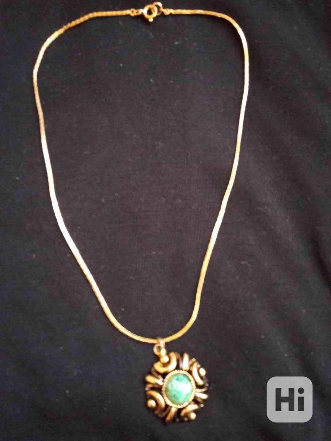 Efektní Art Deco náhrdelník z bižuterního kovu. Plochý řetízek silný cca 2,5mm s přívěskem. Délka řetízku 44cm, zapínání na kroužek, přívěsek vel. 2cm s kamínkem tyrkysové barvy. Nepoškozený. Os. předání možné Praha 2 nebo zásilkovnou za 89.-Kč.