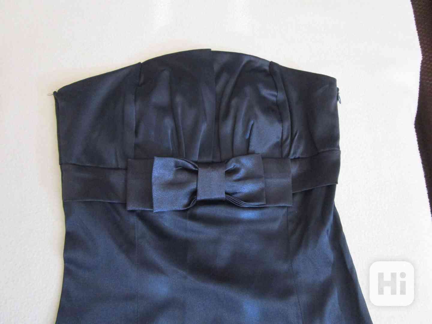 Velmi pěkné černé společenské šaty bez ramínek, vel. XS, vepředu zajímavý střih s mašlí, délka odshora dolů 80 cm, šíře pod průramky 38 cm, vzadu rozparek, jako nové, cena jen 189 Kč.