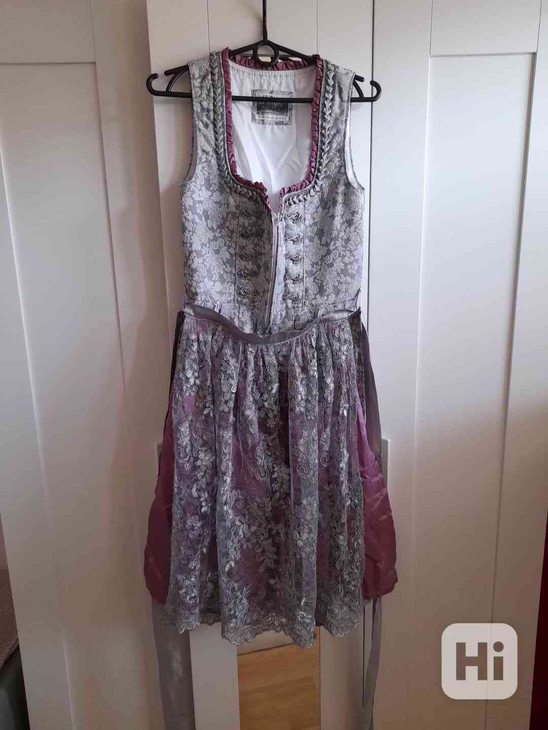 Prodám nádherný rakouský dirndl, šedostříbrný, krajkový s lila lemováním a lila podzástěrkou, krajková zástěrka vyšívaná s korálky, zapínání vpředu na zip, ozdobné kovové patky s bílými štrasovými kamínky. Vel.36, 60% polyester, 40% viskoza, skoro nenošený, vypraný, vyžehlený. Původní cena 220 EURO.